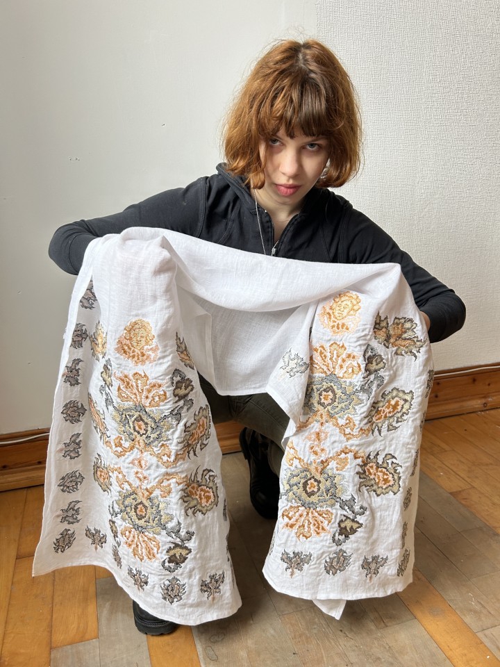 She started at GSA, studying Communication Design, in 2019 but “gradually shifted” towards Fine Art. During the pandemic, she returned to Kyiv for a year, coming back to Glasgow in 2022 after the full-scale invasion of Ukraine by Russia. The war in Ukraine further inspired her to research traditional Ukrainian crafts such as weaving and embroidery, which she now uses in her work.