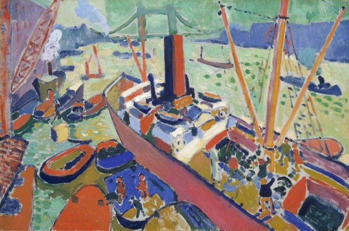 This view of the Thames from London Bridge is one of four works painted by Derain, showing the same part of the river. At this time he was a leading member of the fauve group of painters in Paris. He had been sent to London by his dealer to update the popular Thames views painted by Claude Monet a few years earlier. Strongly-coloured and freely-handled, this painting is characteristic of fauvism in creating vivid effects through bold contrasts of colour. (Source: Tate)