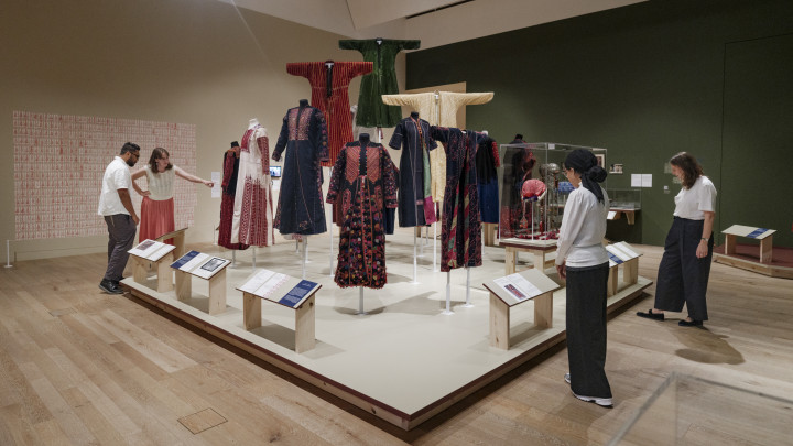 Curated by Rachel Dedman, the exhibition builds on its earlier iteration at Hayy Jameel in Jeddah. Drawing on archives and collections from the Palestinian Museum in the West Bank, the V&A in Dundee and South Kensington, and Art Jameel, the display spans the 19th century to the present, bringing together hand-embroidered material culture - including more than thirty traditional dresses, jewellery and accessories, as well as protest posters, riso-prints, archival photographs, short video interviews, and contemporary interventions. Each object bears witness to everyday life, identity, resilience, and to economic and political shifts, while also carrying the risk of being reduced to mere objects in display cases.