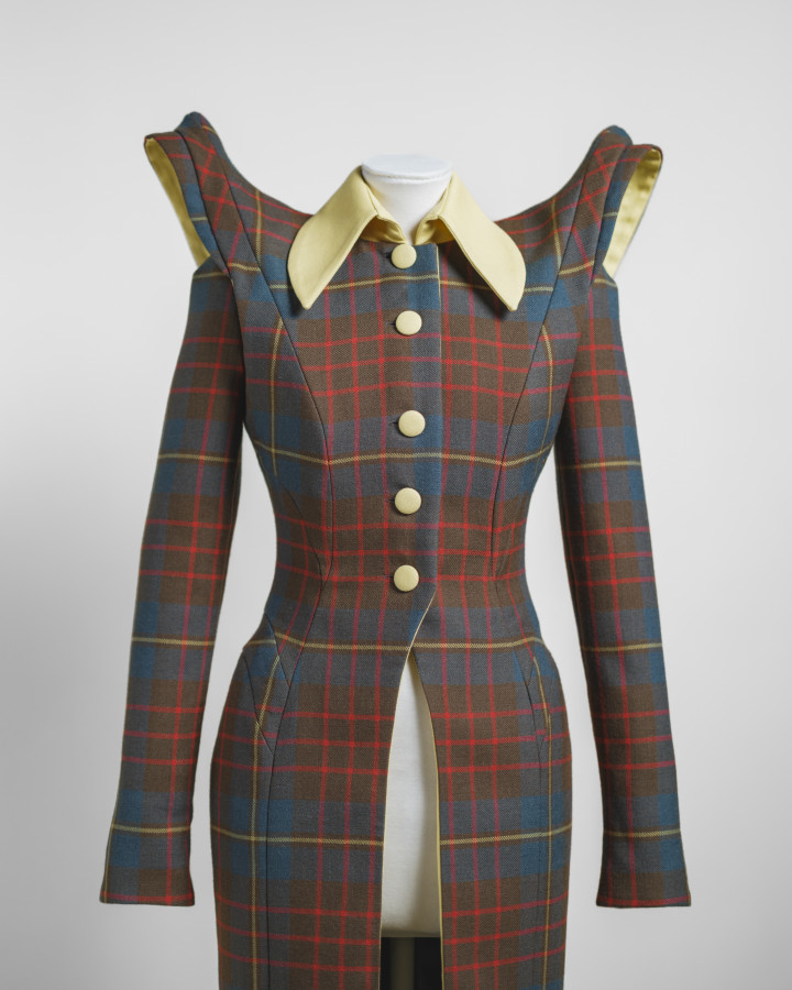 Tatreez also extends into everyday objects and material culture, from embroidered pillow covers and doll dresses to jewellery and accessories, as well as the headdress known as the waqa’a al-darahem, worn by brides and made with coins, beads, glass, shells, and metals - some of which are on display here. The exhibition also traces wider international trade relations and structures of economic control. Garments such as the Bethlehem taqsireh, a short embroidered jacket often made with velvet, appear here lined with tartan, revealing the influence of British textiles exported into Palestine during the British Mandate. The use of cotton, linen, and wool further situates these objects within trade exchange with neighbouring regions.