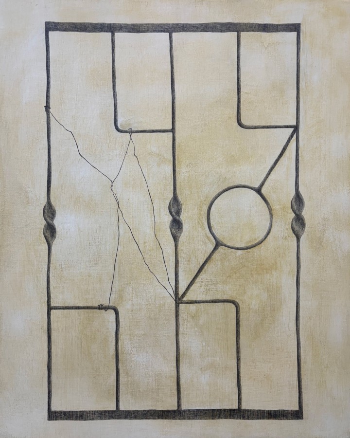 Two of the artworks currently at the Pier Arts Centre, ‘Temporary Solution’ (2025) and ‘Portals’ (2025), offer insights into this approach. Explaining the motif of ‘Temporary Solution’: “It was a piece of rope. Someone actually used it to patch up a missing bit of railing to make it safer. It’s not particularly beautiful but I think there’s something about these really sharp lines the water. It just really captivated me. I think it speaks to my general interest in things that are temporary.” ‘Portals’, after which the exhibition is named, has deteriorating mountaineering fence posts, specifically their holes, as its subject. “They decorate the mountain in a really strange way, and they've just been abandoned and lost their function. They just exist there in the middle of nowhere.”