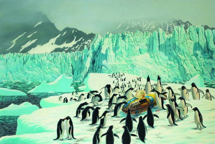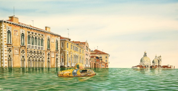 The shift is there in the titles. The painting of the submarine among the penguins is called ‘Trip of a Lifetime’, one of the Venice paintings is called ‘High Water’ (‘Acqua Alta’) to reflect rising sea levels rising. “The submarine is a metaphor for us humans in the natural environment, blundering around, or just being bystanders. That’s what I feel on a more serious level, do humans treat nature as a resource that can be plundered, or realise that we are part of nature?”