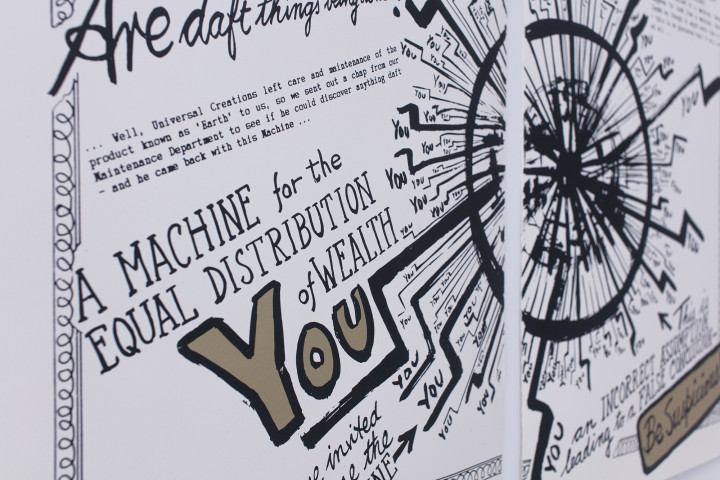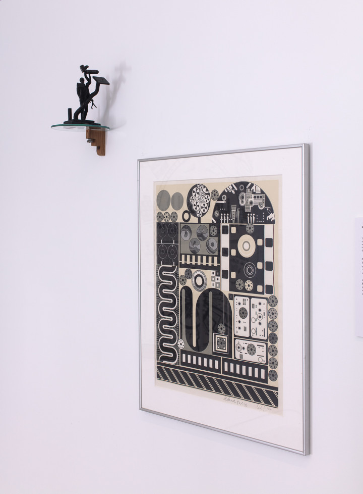 So, we see photographic documentation of Wyllie in Beuys’ studio, as snapped by Richard Demarco, and the New Tendencies in Scottish Contemporary Art: Sarajevo (1988) exhibition that gifts this one its title. There are photographic remnants of the 1990 Venice Biennale from David Mach, Kate Whiteford and Watson. Exercises in aluminium, bronze and steel by fellow travellers such as Benno Schotz, Jake Harvey, Frank Pottinger, Gareth Fisher and Fred Bushe are on show, as is an untitled screenprint by Eduardo Paolozzi. From Wyllie himself, pages from his ‘A Day Down a Goldmine' book, a giant catapult, and a witty take on Adam Smith’s own greatest hits with Adam Also Wrote ‘The Moral Sentiments’. (2001).